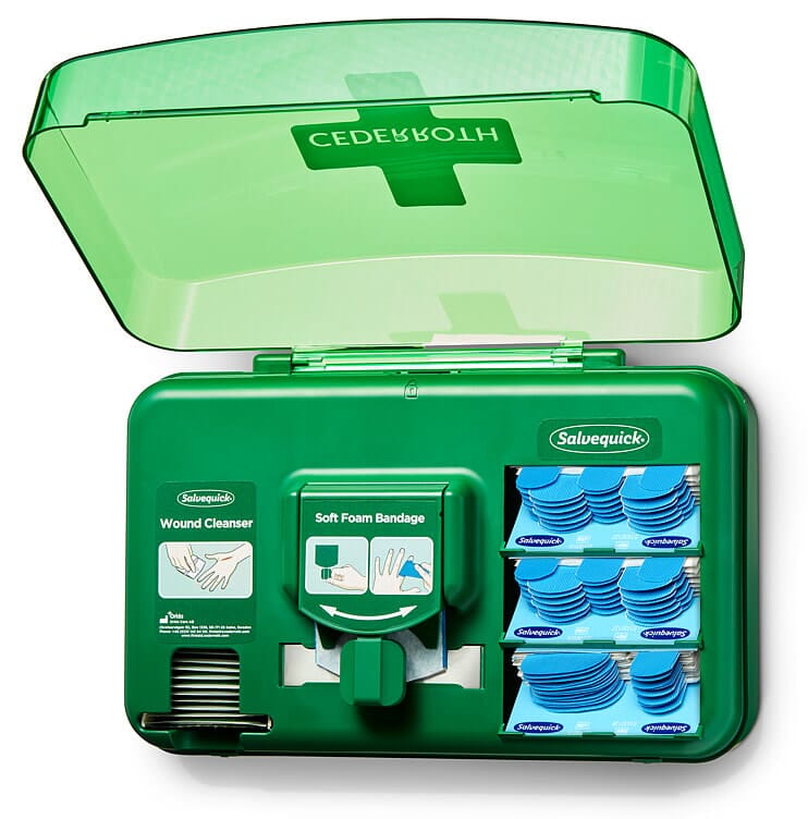 Det meste av det du trenger for å håndtere mindre sårskader i en praktisk dispenser. Inneholder Soft Foam Bandage Blue, et selvheftende, limfritt plaster som blir sittende også i vann.