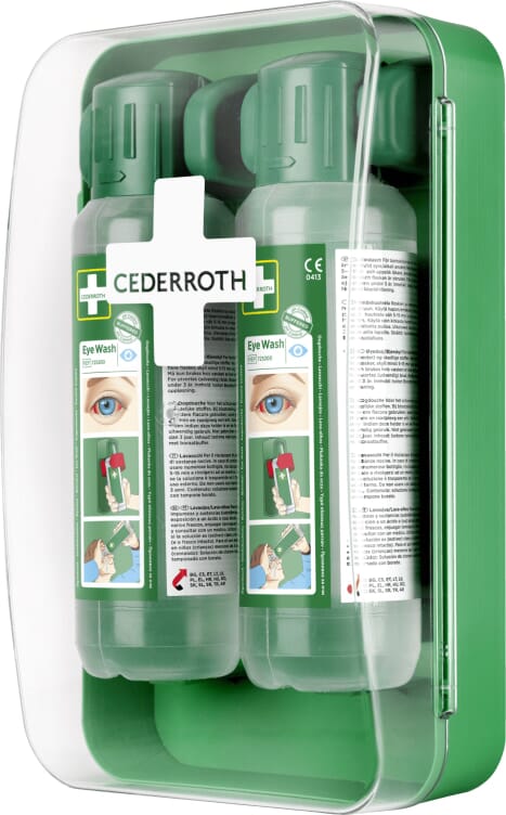Inkluderer 2 flasker Cederroth Øyedusj. Lett å få plass til også i mindre rom. Transparent lokk for høy synlighet. Flaskene åpnes automatisk når de vris ut av holderne, og skylling kan starte øyeblikkelig.