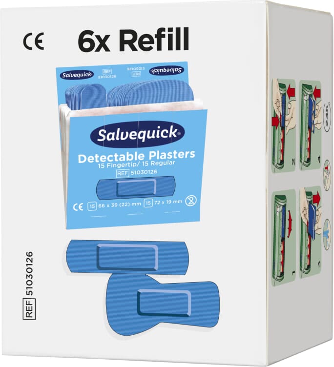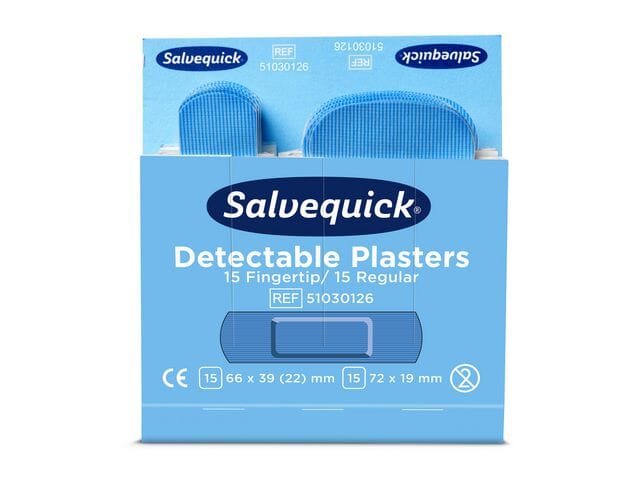 Salvequick Blue Detectable plaster er spesielt beregnet for bruk i næringsmiddelindustrien. Plasteret oppdages av de fleste metalldetektorer og den blå fargen gjør også at plasteret er lett å oppdage visuelt