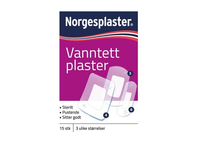 Hudvennlige vanntett plaster fra Norgesplaster® i 3 ulike størrelser.