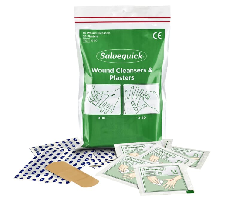 Praktisk pose med Salvequick Plaster og Savett Sårvask
