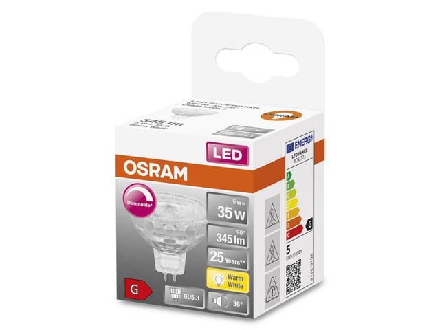 Dimbar lavspent LED-reflektorlampe MR16 med GU5,3 sokkel. Produktegenskaper: LED-alternativ til konvensjonelle 12 volts lamper. Kan dimmes med mange vanlige dimmere. - Kvikksølvfrie lamper.