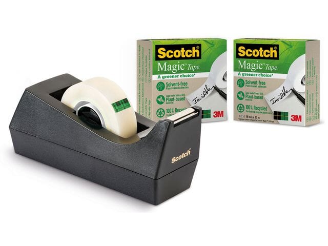Den solide Scotch® C38-dispenseren passer fint på alle typer skrivebord eller arbeidsflater og er laget av 100 % gjenvunnet plast. Med de innebygde vektene og gummibasen kan du trygt rive teip med én hånd mens du holder en pakke i den andre hånden. Hver påfyllbare dispenser leveres komplett med 3 ruller miljøvennlig Scotch® Magic™-teip for å få deg i gang. Denne teipen har en kjerne laget av 100 % resirkulert kartong og plast, og er laget av 53 % plantebaserte materialer. Den har også plantebasert lim som ikke inneholder løsemidler. Magic™-teipen er klar når den påføres, og har en jevn og matt overflate som gjør den usynlig på fotokopier. Dette settet med teip og dispenser er et flott alternativ til lim, og kan brukes til teiping av papp eller små pakker, eller til å reparere papirrifter i bøker eller andre viktige papirprodukter.