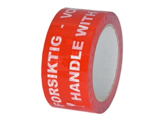 Tape med rød/hvit tekst: 'FORSIKTIG'. Emballasjetape for merking av forsendelser. Tapen har teksten 'Forsiktig' på tre forskjellige språk: Norsk / Engelsk /Tysk. - Materiale: PP med akryllim. - Mål (BxL): 50mmx 66m.