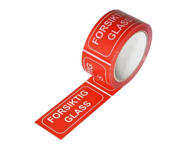 Tape med rød/hvit tekst: 'FORSIKTIG GLASS'. Emballasjetape for merking av forsendelser. - Materiale: PP med akryllim. - Mål (BxL): 50mmx 66m.