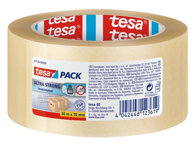 tesapack® Ultra Strong-teipen er slitesterk og består av kraftig naturgummilim som festes til både glatte og ujevne overflater. Denne industri-PVC-pakketeipen rulles enkelt ut med lite støy, slik at det forstyrrer mindre på travle arbeidsplasser. Den ultrasterke tesa®-teipen verken revner eller krøller seg. Den brukes primært til å forsegle tunge pappesker og pakker eller til å bunte sammen løse gjenstander.