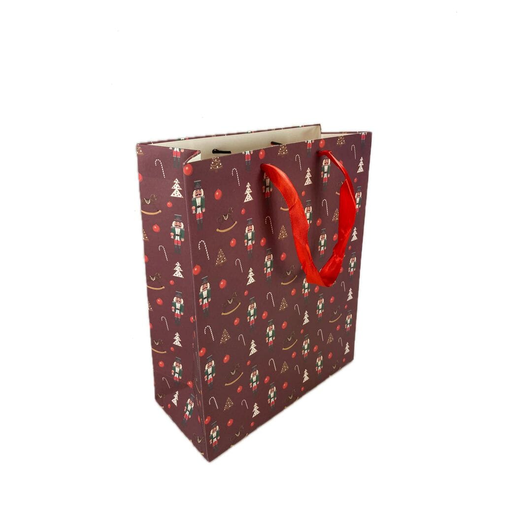 Stor gavepose med nøtteknekker på rødt kraftpapir med silkehåndtak. Praktisk og stor gavepose med nøtteknekker på rødt kraftpapir med silkehåndtak. Idell til å frakter gaver. Særlig egnet til julehandlen. - Mål: B: 265mm H:330 D:120mm