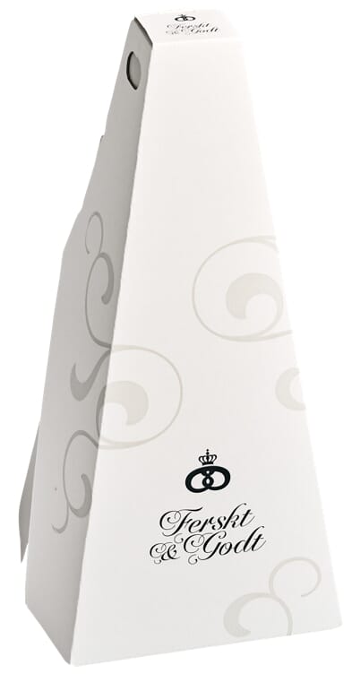 Pyramideformet kakeeske / kransekakeeske som passer perfekt til kransekake 24 ringer. Esken har et enkelt og tidløst uttrykk. Sett gjerne på egen etikett på øvre del av esken for et mer personlig preg. Størrelsen på esken er: 245x245x565mm. Serien har flere størrelser av kransekakeesker og andre kakeesker. Det må brukes en tilstrekkelig barriere mellom matvaren og esken, da det ikke skal være direktekontakt med fete matvarer. Den kan kun være i direktekontakt med tørre matvarer.