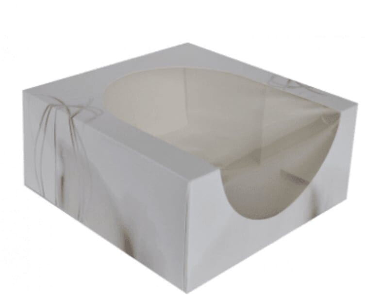 Delikat og pen kakeeske med lokk og vindu. Størrelse 22x22x10cm. Esken er hvit med et enkelt og diskret mønster. Godkjent for direkte kontakt med tørre, fuktige, sure og fete matvarer. Kartongemballasjen er egnet for bruk under følgende temperaturer: . Fryse/kjøleskap (sakte frysing). . Romtemperatur (opptil 40° i mer enn 24 timer). . Kartongemballasjen kan ikke brukes i mikrobølgeovnen eller i en vanlig ovn.