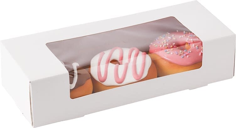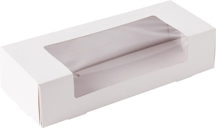 Eske med vindu i størrelsen 26x10x6 cm. Esken har hvit utside og kommer i kartong med 100 stk. Perfekt til småkaker, donuts, bakverk. Gir godt innsyn på produkt.