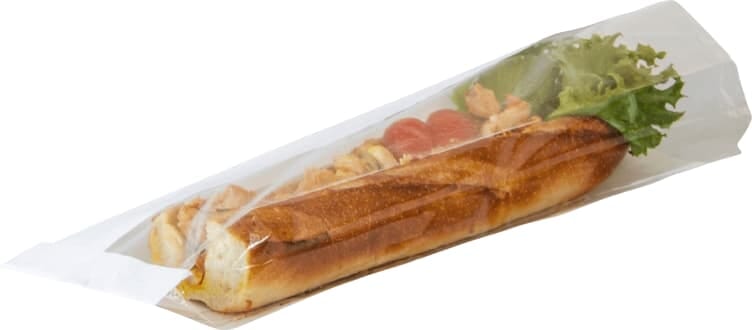 Hvit baguettepose med vindu som gir godt med innsyn. Vinduet er perforert i sidefalsen. Egnet for tørre og lite fettholdige matvarer. Lengde 385mm., bredde 100mm. og dybde 45mm. Perfekt til påsmurte baguetter.