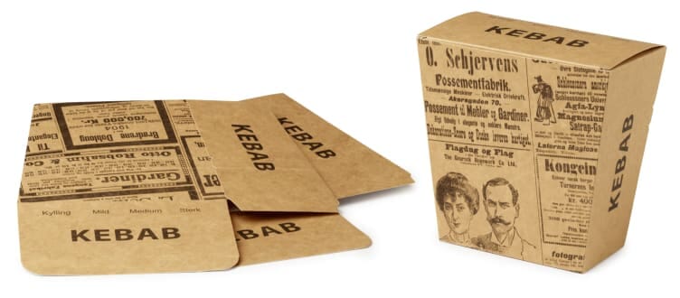 Brun kebabboks med avisdesign. Boksen har perforering i toppen som kan rives av for å enkelt kunne nyte produktet som serveres. Passer perfekt for kebab, hamburger eller andre retter. Mål: 12x7x15,5cm