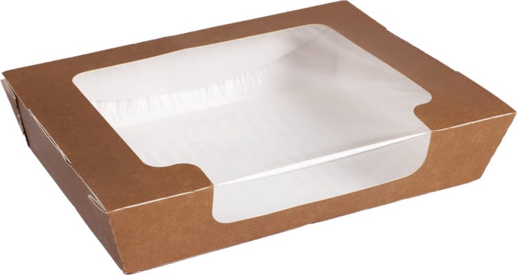 Boks i kartong til salater, påsmurt og andre kalde retter. Stort vindu på topp og side for godt innsyn til produkt. Boksen er coatet innvendig og tåler derfor noe fukt.