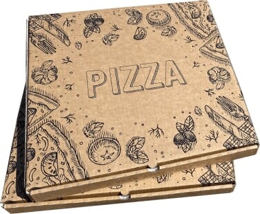 Produsert i Norge med brun utside og hvit innside. 3mm tykkelse for å holde godt på varmen. 2 hull for dressingbeger i lokket om nødvendig. Eget felt på to sider ev esken for egen merking av bestillingsnummer eller type. Egen merking i bunn av esken med produsent, sortering, glass og gaffelsymbol.Esken må kombineres med pizzaunderlag!