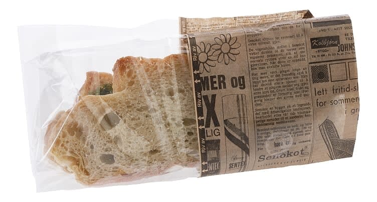 Snackbag / emballasje til påsmurt med det populære avistrykket. Passer til baguetter, wraps og tilsvarende. Riv av plastdelen, hold i papirdelen og nyt maten. Størrelse L, 21x13cm. Del av en serie.