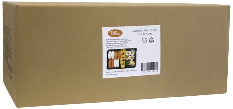 Sushibrett og lokk for ca 15 biter sushi og tilbehør. Tåler alle typer næringsmidler. Kan brukes fra -20 til 100 grader celsius. 25x16x5cm Godkjent for: - temperaturer mellom -20 og 100 grader celsius - frysing Ikke godkjent for: - bruk i mikrobølgeovn, oppvaskmaskin - temperaturer over 100 gader celsius Lokk på innsiden