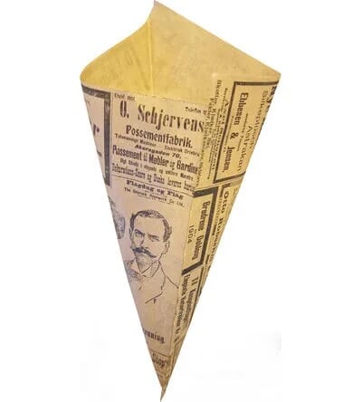Brun kremmerhuspose med avisdesign. Egner seg til servering av pommes frites, fish chips, godis eller andre matvarer. Mål: 210x200mm