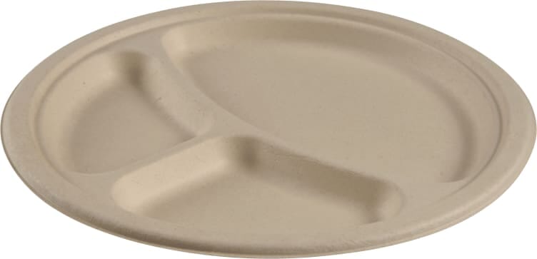 ABENA Gastro 3-roms fiber tallerken 3-Delt, diameter 26cm. Tallerkenen er laget av sukkerrør og er komposterbar. Materialets tekstur gjør produktet stivt, hvilket gjør tallerkenen stabil. Et godt alternativ til plast, og velegnet for de fleste typer mat.