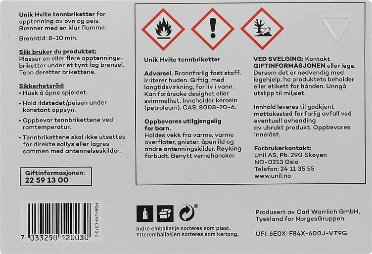 Hvite tennbriketter for opptenning i peisen, ovnen, grillen og bålet. Basert på paraffin.