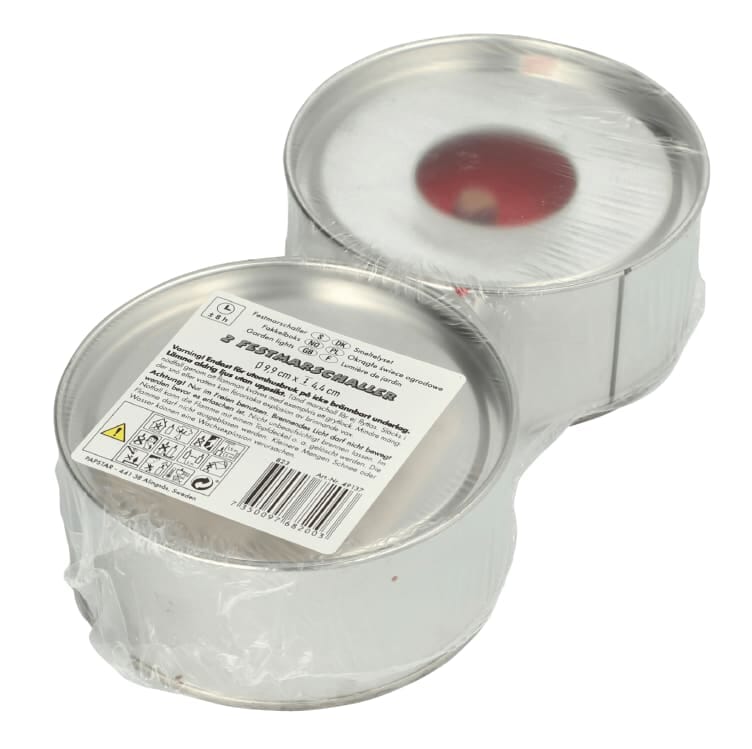 Fakkelboks med parafinvoks i sølvfarget boks med lokk. 8 timers brenntid.