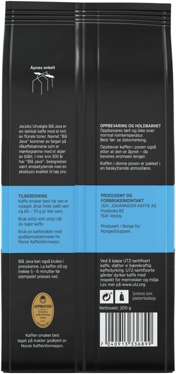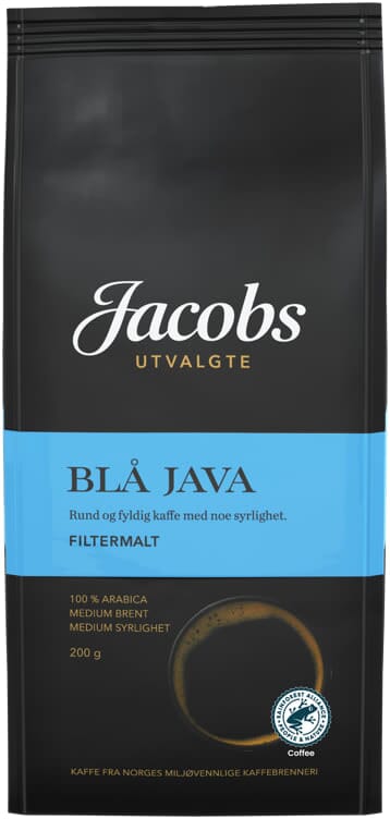 Jacobs Utvalgte Blå Java er en delikat kaffe med et hint av florale toner. Navnet «Blå Java» kommer av fargen på råkaffe-bønnene som er mørkegrønne med et skjær av blått. I mer enn 300 år har «Blå Java»- betegnelsen vært ensbetydende med en eksklusiv kvalitet til høy pris. Kaffen er UTZ-sertifisert. Ved å kjøpe UTZ-sertifisert kaffe, støtter vi bærekraftig kaffedyrking. UTZ-sertifiserte gårder dyrker kaffe med respekt for mennesker og miljø. Les mer på www.utz.org. Jacobs Utvalgte kaffe blir produsert på Norges miljøvennlige kaffebrenneri som ble åpnet i 2020. Brenneriet er hovedsakelig bygget i tre, og drives med 100% fornybar energi. Du kan lese mer om Norges miljøvennlige kaffebrenneri på www.johjohannsonkaffe.no. Vi samarbeider med Miljøfyrtårn og Grønt Punkt Norge for å tilby norske forbrukere miljøvennlig kaffe.