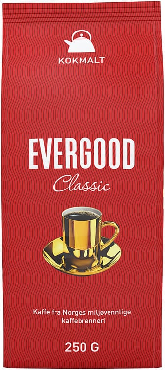 EVERGOOD Kaffe består av 100% Arabica-bønner fra Colombia, Kenya, Costa Rica, Brasil og Guatemala. I frodige fjellområder høyt over havet, finnes det unike klimaet som modner kaffeplantens bønner langsomt. Slik får den fyldige, aromatiske smaksrikdommen som kjennetegner EVERGOOD Kaffe tid til å utvikle seg. En nøye utvalgt blanding der vi henter en søtlig syrlighet fra Kenya, mens bønner fra Colombia bidrar med silkemyk balanse, god fylde og en lang, elegant ettersmak. EVERGOOD Kaffe er 50% Rainforest Alliance-sertifisert. Rainforest Alliance er en internasjonal organisasjon som jobber for å bevare biologisk mangfold og bærekraftig livsgrunnlag. Sertifiseringsordningen til Rainforest Alliance garanterer at råvarene er produsert under verdige og miljøvennlige forhold. Les mer på www.ra.org. EVERGOOD Classic blir produsert på Norges miljøvennlige kaffebrenneri som ble åpnet i 2020. Brenneriet er hovedsakelig bygget i tre, og drives med 100% fornybar energi. Du kan lese mer om Norges miljøvennlige kaffebrenneri på www.evergood.no. Vi samarbeider med Miljøfyrtårn og Grønt Punkt Norge for å tilby norske forbrukere miljøvennlig kaffe.