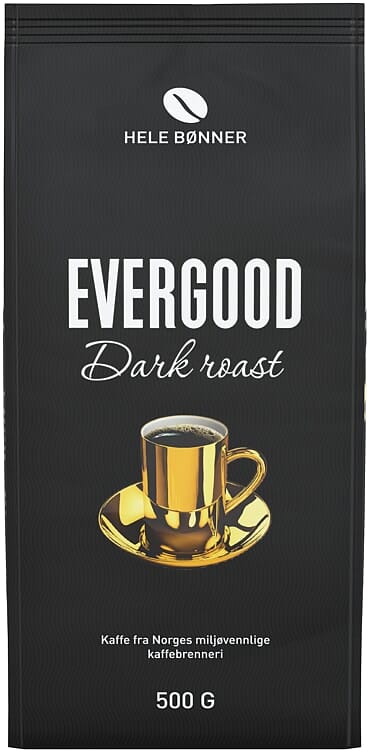 EVERGOOD Kaffe består av 100% Arabica-bønner fra Colombia, Kenya, Costa Rica, Brasil og Guatemala. EVERGOOD Dark Roast er en mørkere brent kaffe med kraftig aroma og kontinentalt preg. I frodige fjellområder høyt over havet, finnes det unike klimaet som modner kaffeplantens bønner langsomt. Slik får den fyldige, aromatiske smaksrikdommen som kjennetegner EVERGOOD Kaffe tid til å utvikle seg. En nøye utvalgt blanding der vi henter en søtlig syrlighet fra Kenya, mens bønner fra Colombia bidrar med silkemyk balanse, god fylde og en lang, elegant ettersmak. EVERGOOD Kaffe er 50% Rainforest Alliance-sertifisert. Rainforest Alliance er en internasjonal organisasjon som jobber for å bevare biologisk mangfold og bærekraftig livsgrunnlag. Sertifiseringsordningen til Rainforest Alliance garanterer at råvarene er produsert under verdige og miljøvennlige forhold. Les mer på www.ra.org. EVERGOOD Dark Roast blir produsert på Norges miljøvennlige kaffebrenneri som ble åpnet i 2020. Brenneriet er hovedsakelig bygget i tre, og drives med 100% fornybar energi. Du kan lese mer om Norges miljøvennlige kaffebrenneri på www.evergood.no. Vi samarbeider med Miljøfyrtårn og Grønt Punkt Norge for å tilby norske forbrukere miljøvennlig kaffe.