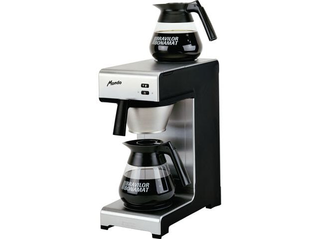 Mondo trakter deilig fersk kaffe i glasskanner på en rask og enkel måte hvor som helst. LED-display, filterholder i rustfritt stål og integrerte varmeplater gjør at maskinen er enkel i bruk. - Manuell vannpåfylling gjør at maskinen kan plasseres hvor som helst - De to selvregulerende varmeplatene opprettholder riktig temperatur på kaffen, og selv om kannen ikke er full sikres optimal kaffekvalitet - Et signal indikerer om maskinen er fylt med vann - Maskinen varsler når kaffen er klar og når det er behov for rensing - 2 glasskanner medfølger - Kapasitet per time: 18 liter - Traktetid: 5 minutter - Mål (B x D x H): 195 x 406 x 446 mm.