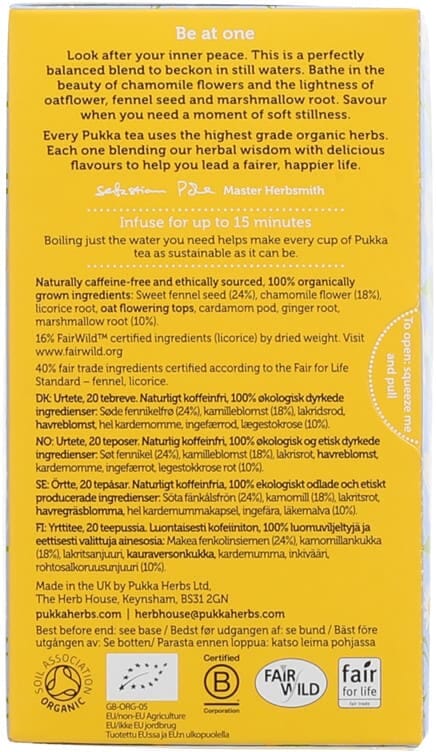 En avslappende te satt sammen av de fineste kamilleblomster, havreblomst (glutenfri), fennikelfrø og legestokkrose