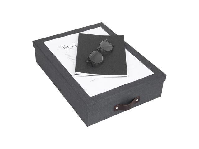 Enkel og stilren oppbevaringsboks for papirer, dokumenter og småsaker. Elegant design med lærhåndtak, og passer i de fleste hjem og kontor.