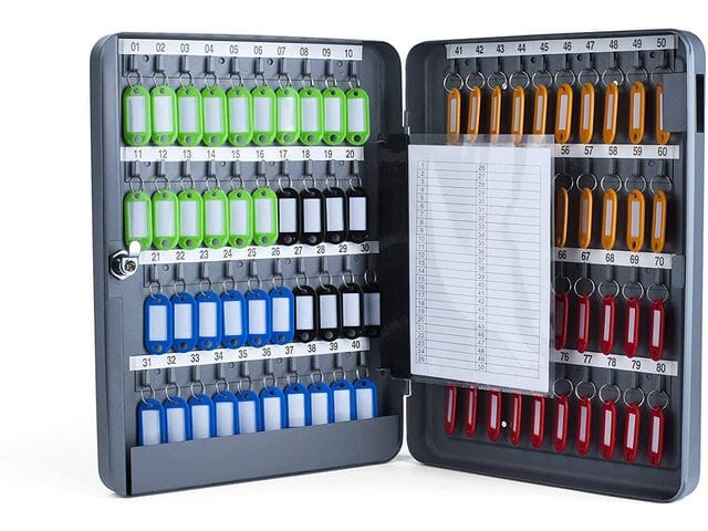 Nøkkelskap PAVO plass til 80 nøkler leveres med nøkkelbrikker, selvklebende tall, etikettbord og veggfester. Funksjoner et unikt nøkkelreturspor for å returnere kjeder uten hovedlås.