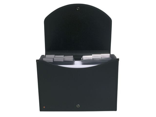 Håndtak med et komfortabelt grep13 romLagringskapasitet: 400 A4-arkUtskårne vinduer gir deg utmerket oversikt over skillearkeneHvite etiketter til kategoriseringFordypning i midten av skillearkene som gjør det enkelt å ta ut innholdetLett, slitesterk og robustTrykknappslås for sikkerhetMateriale: 80 % resirkulert polypropylenMål: 330 x 260 mmFarge: Svart