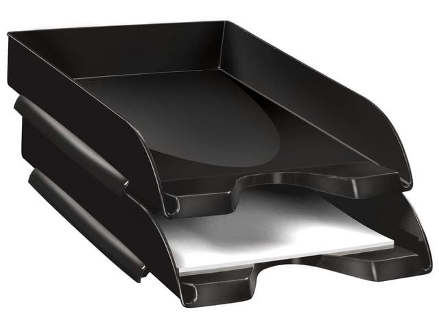 Laget av 90 % gjenvunne materialer Med bredt innsnitt på forsiden for brukervennlighetRett eller trappeformet stabel for effektiv organiseringHar plass til både dokumenter og hefter på opptil 240 x 320 mmFarge: sortStørrelse: 345 x 260 x 64 mm