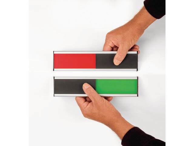 Dørskilt Legamaster® som forteller om lokalet er ledig eller opptatt. Aluminiumsramme med plastdeksel som kan skyves til venstre eller høyre, slik at rød eller grønn markering blir synlig.