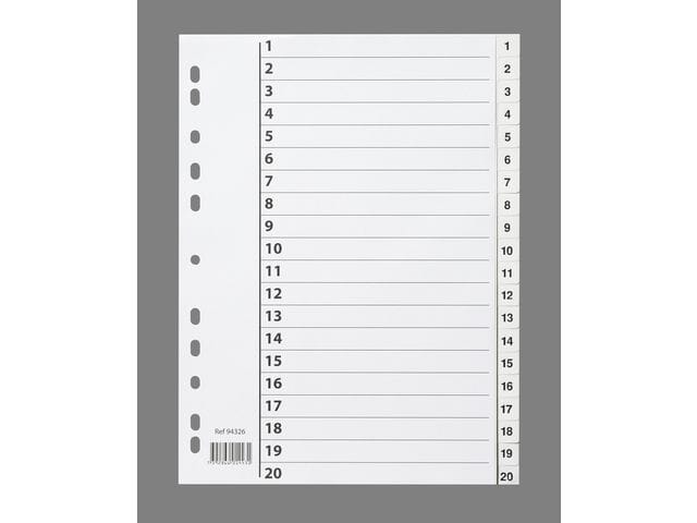 Forhåndstrykte skilleark, merket 1–20Slitesterk konstruksjon som tåler bruk og slitasjeUniverselle perforeringer gjør at de kan brukes med flere ringpermer og arkiveringssystemerMateriale: plastStørrelse: A4Farge: Hvit