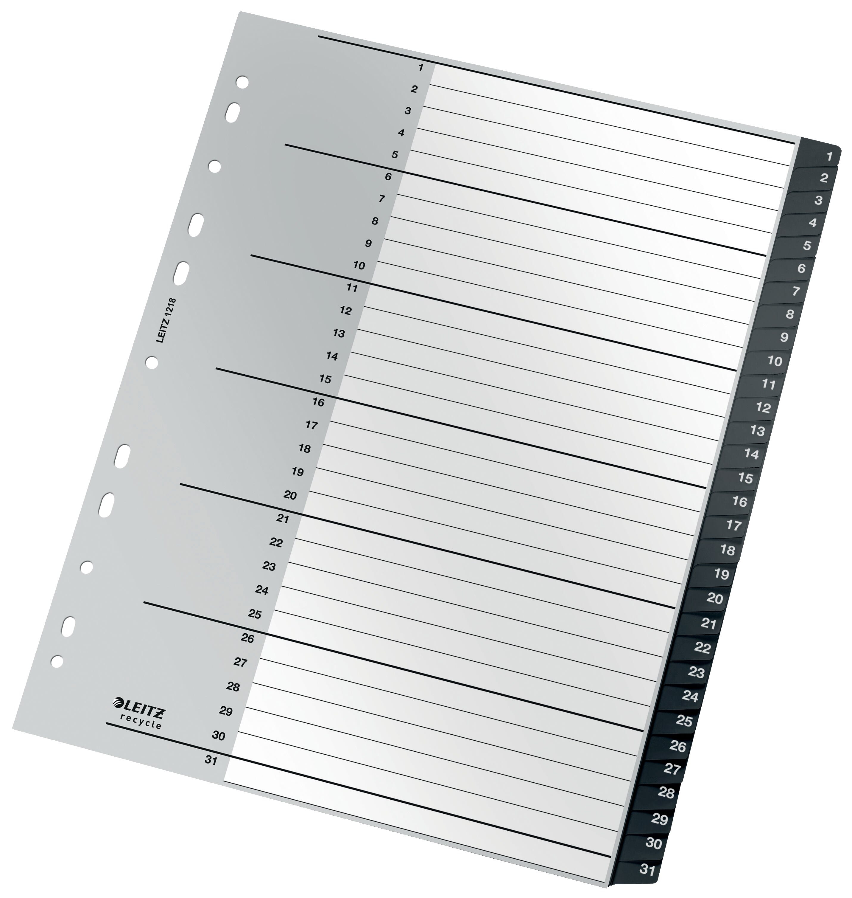 31 faner med 1-31 for rask dokumenttilgangDekker ikke over fanene når de brukes med lommer takket være ekstra bredt A4 maxi-formatSlitesterkt 160 g / 100% resirkulert kartong forsideark med stor plass for innholdsbeskrivelseUniversal 11 hulls hullkant for enkel arkivering i alle typer permer og mapperPP-overflate er enkel å tørke av og er slitesterk og rivefast0,115 mm resirkulert PP90% resirkulert plast, klimanøytralt og 100% resirkulerbart.