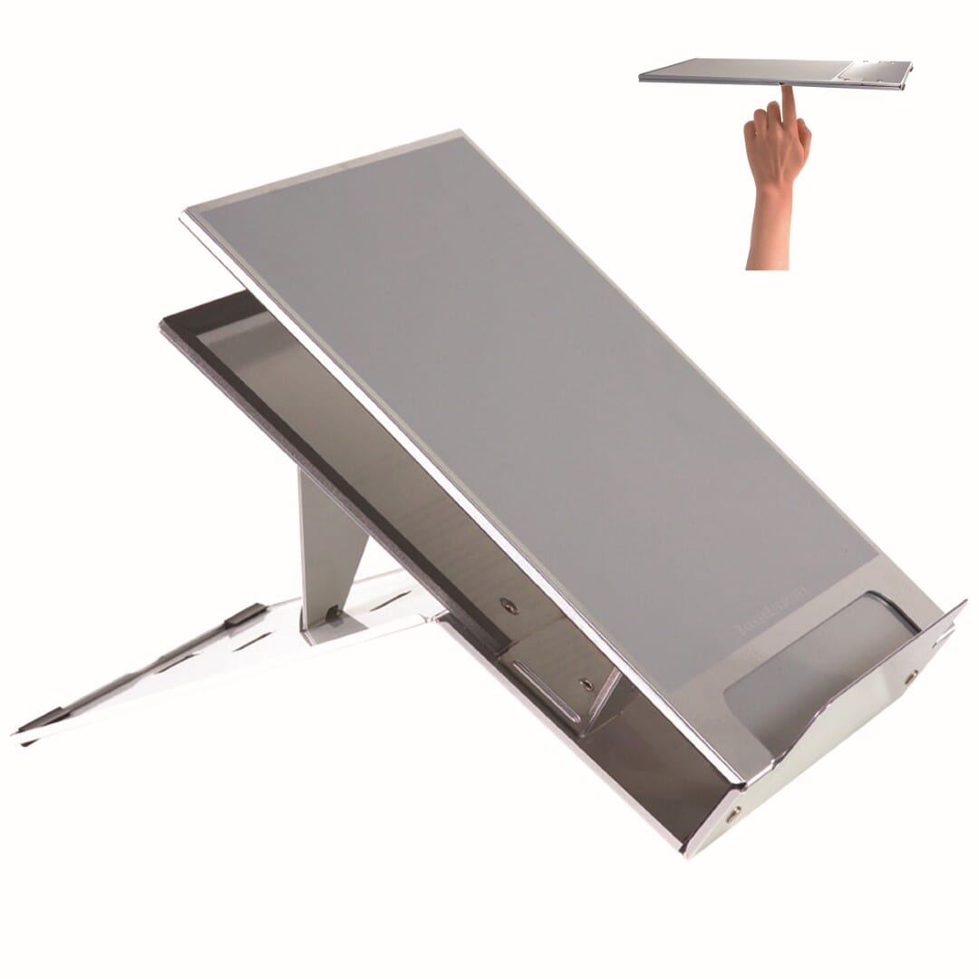 Laptop holders raise the screen of the laptop and reduce the viewing distance. This places much less stress on one's neck, and one can work much more comfortably. Laptop holders med a document holder also increase productivity. BakkerElkhuizen laptop holders increase productivity by 17%, reduce stress on the neck by 32% and result in 21% more comfort.Ergo-Q 260 is a portable, aluminum design notebook stand med integrated pivotable document holder