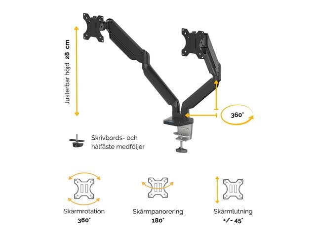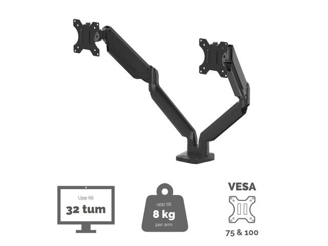 Med denne praktiske doble skjermarmen kan du spare plass på pulten samt forbedre holdningen din.