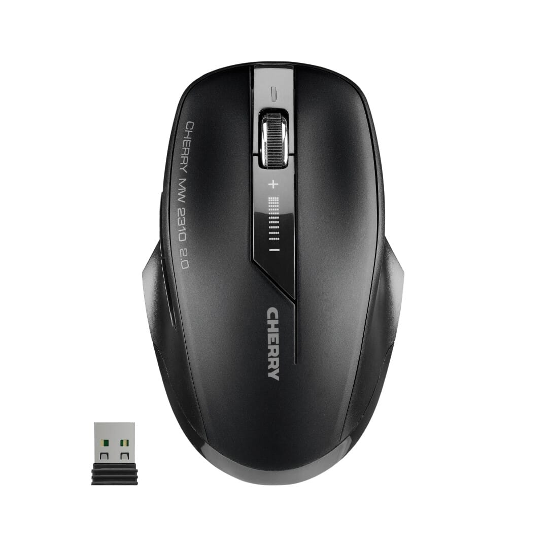 The CHERRY MW 2310 2.0 is a versatile 6-button wireless mouse med 2.4 GHz technology and an ergonomic design. Its nano USB receiver is so small that it can safely stay inside the notebook even when you're on the move – the mouse is always ready for use. The CHERRY MW 2310 2.0 has an optical sensor med 3 adjustable resolutions (1000/1600/2400 DPI). Using the DPI switch on the top of the mouse, the resolution can be selected at the touch of a button. An LED indicates the selected DPI. The technical concept makes the successor to the legendary CHERRY MW 2310 especially energy-efficient. med just one set of the supplied batteries (2 x AA), the mouse can be operated for up to 3 years before they have to be changed. The mouse has an On/Off switch on the bottom so it can be switched off completely when not in use. Advanced materials, a comfortable feel and great versatility make the CHERRY MW 2310 2.0 what it is – the CHERRY mouse for superior performance at a surprisingly low price.