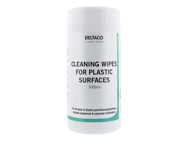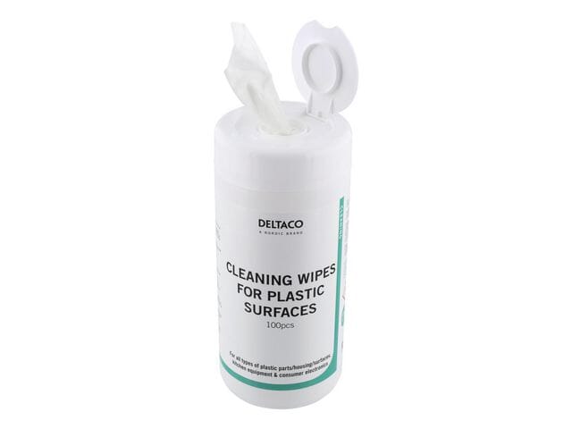 DELTACO våtservietter for rengjøring av plastoverflater. - Inneholder 100 store våtservietter - Biologisk nedbrytbare - Farge: hvit