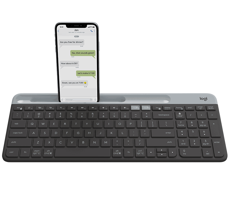Tastaturet har et dedikert område bak Fn-tastene med plass til nettbrettet eller smarttelefonen din og plasserer dem i en optimal vinkel.