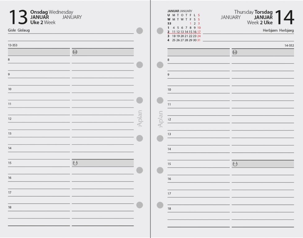 Praktisk års-sett for din Aplan perm.Unihulling gjør at det passer i de fleste permer, også Filofax samt Grieg, Alle papirbaserte Aplan produkter er miljøsertifisert etter anerkjente internasjonale standarder slik at de minst mulig påvirker vårt felles ytre miljø. Sidestørrelse: 8,2 x 12,8 cm Hullet for Aplan 70 gr papir En dag pr. side Norsk Klokkeslett fra-til: 08:00-18:00 2 farger sort og rød i kalender Årsoversikt innværende og neste år Månedoversikt inneværende og neste år Notatsider 16 siders atlas Norske navnedager © Norske helligdager