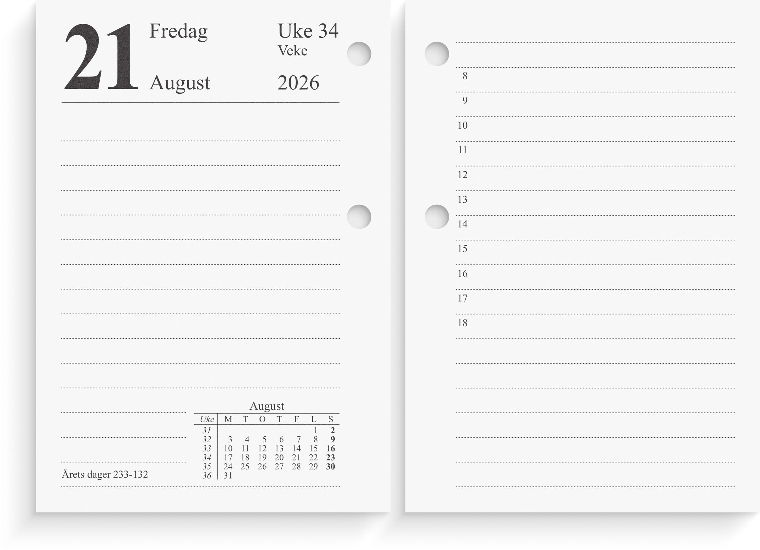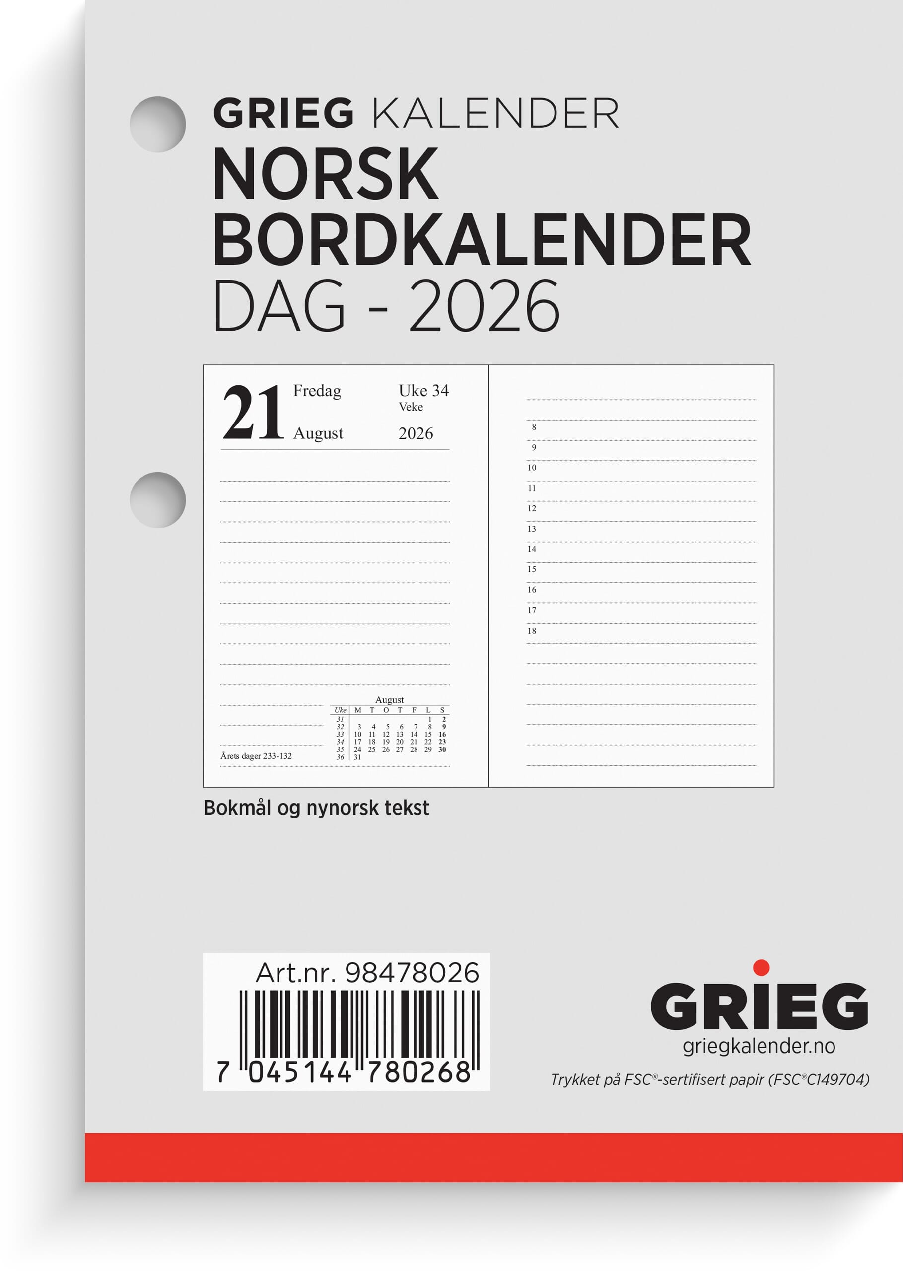 Norsk bordkalender er perfekt å ha på pulten på kontoret! Den gir deg full oversikt over hvilken dato som er aktuell og den er samtidig liten slik at den ikke stjeler for mye plass. Her får du en dag per side i oppslag og plass nok til å notere. Daglig info om den aktuelle dagen. Kalenderen er miljømerket FSC®, som betyr at hele produktet er produsert med papir og annet trevirke fra et ansvarlig og bærekraftig skogsbruk. Den inneholder månedsoversikt og årsoversikt. - Følger kalenderåret - Omslag i kartong - Hullet for passende stativ 92 3666 00(Kjøpes separat) - Bokmål og nynorsk - Stående dag/oppslag. Timeinndeling 8-18 - Antall sider: 640 - Papirvekt: 60g - Format: 82x120mm