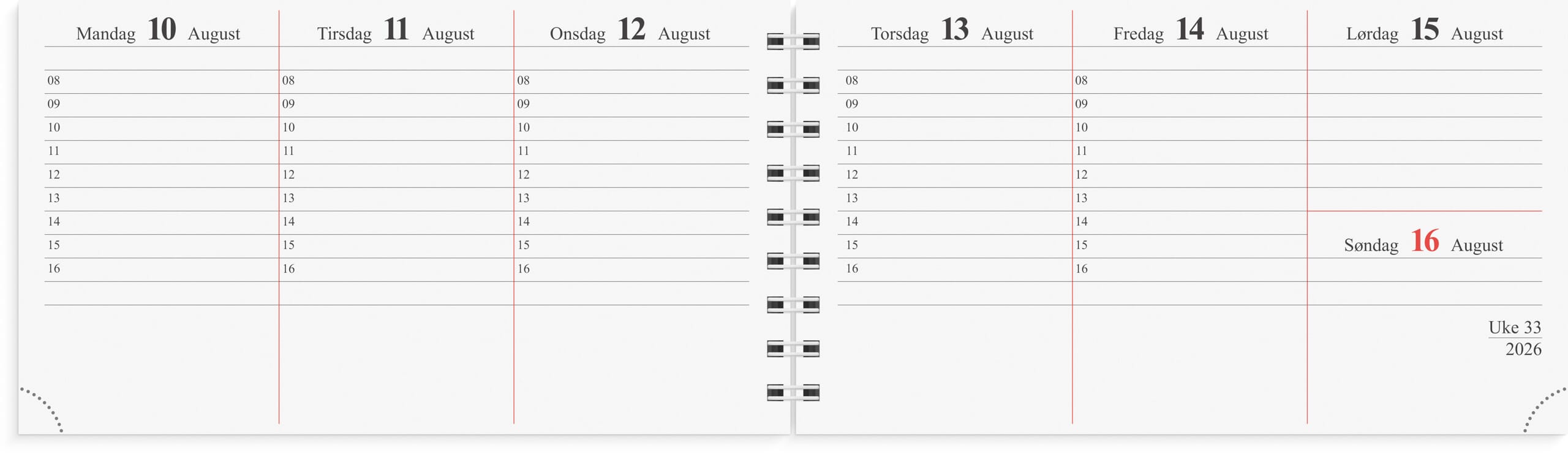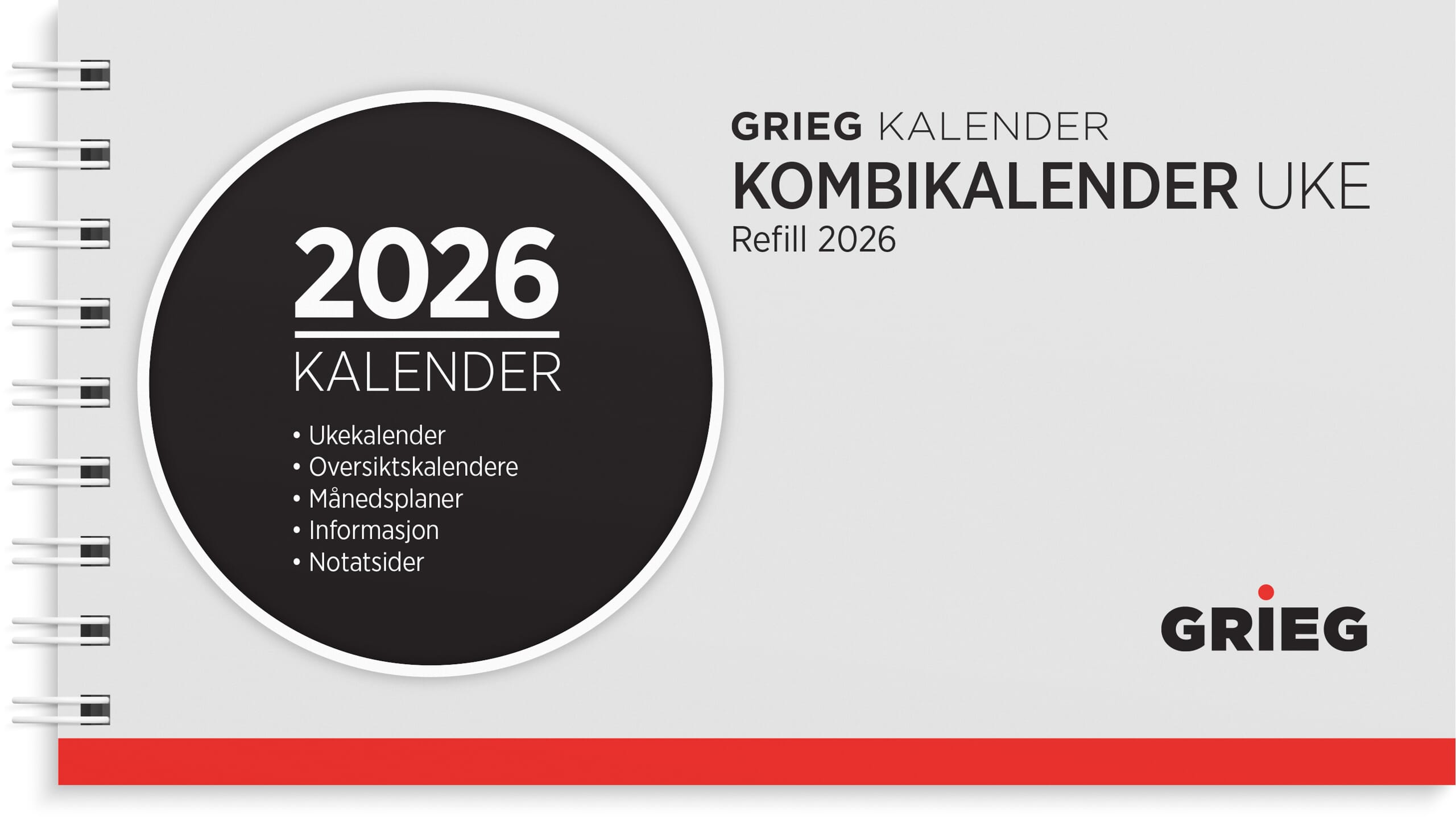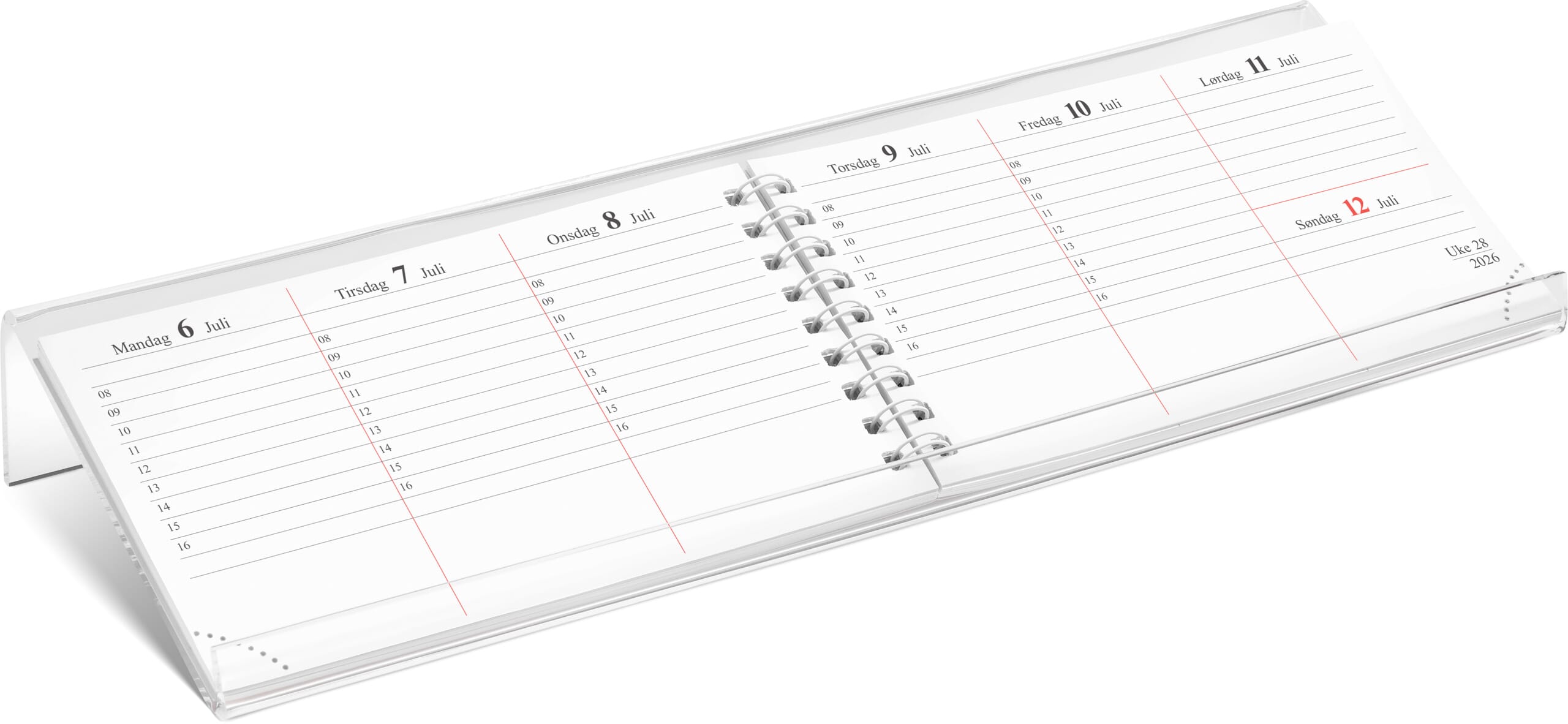 Kombikalender uke er en spiralisert bordkalender med ukeoppslag - hele uken over to sider. Kalenderen er miljømerket FSC®, som betyr at hele produktet er produsert med papir og annet trevirke fra et ansvarlig og bærekraftig skogsbruk. Den inneholder månedsoversikt og årsoversikt. - Følger kalenderåret - Omslag i kartong - Spiralisert - Passer til stativ 92 2587 00 (Kjøpes separat) - 3 mnd. oversiktskalender - Notatplass hver uke - Stående uke/oppslag. Timeinndeling 8-16 - Telefonguide - Hjørneperforering - 128 sider - 80g papir - Format: 149,5x84mm