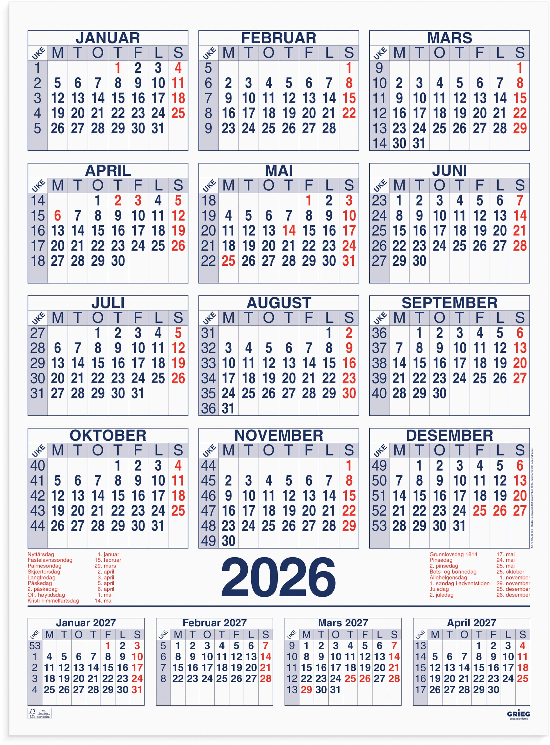 Den store plakatkalenderen er ett must på kontoret! Her har du oversikt fra januar og til april året etter (16 måneder). Kalenderen har metallskinne oppe og nede slik at den henger fint på veggen. Dette er det ultimate verktøyet for planlegging av ferie, leveranser som går over forskjellige uker, skiftarbeid eller annet som krever full oversikt. Oversikt over helligdager. Kalenderen leveres i hylse. Opphengshull gjør den enkel å henge på veggen. Kalenderen er miljømerket FSC®, som betyr at hele produktet er produsert med papir og annet trevirke fra et ansvarlig og bærekraftig skogsbruk. - Følger kalenderåret - Metallskinne oppe og nede - Opphengshull - Helligdager - Liggende år/oppslag - 1 side - 150g papir - Format: 590x800mm