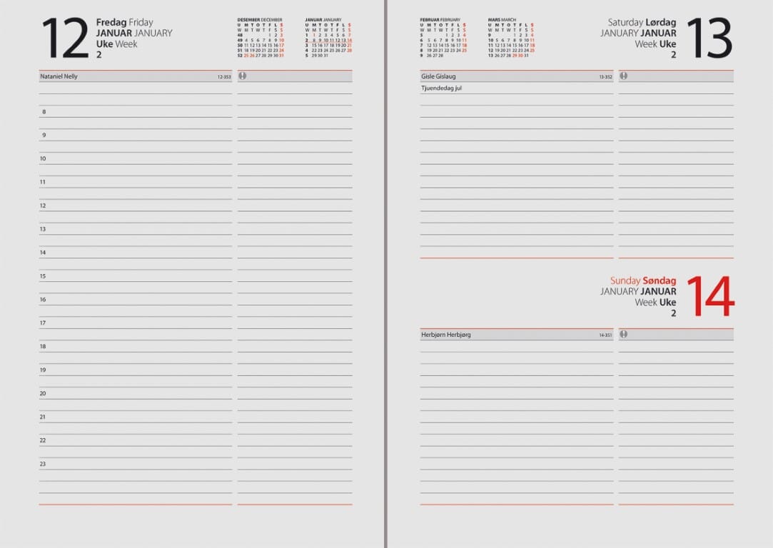 7.sans Dagbok er storselgeren hva gjelder avtalebok i A5 format. God kvalitet på omslag og innhold sikrer dine notater. Meget hendig å ha med seg. Veldig god plass for notater hver dag. Finnes i utallige versjoner. Fast innbundet eller spiralisert. Med eller uten utstansede månedstabber. Et utall av design og farger. Meget anvendelig for alle formål. Alle 7.sans produkter er miljøsertifisert etter anerkjente internasjonale standarder slik at de minst mulig påvirker vårt felles ytre miljø. Sidestørrelse: 14,8 x 21 cm A5 Hjørneperforering 70 gr papir En dag pr. side Norsk Klokkeslett fra-til: 08:00-23:00 Røde søndager og helligdager Årsoversikt innværende og neste år Månedoversikt inneværende og neste år Notatsider Norske navnedager © Norske helligdager