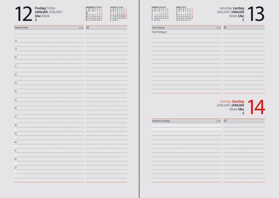 7.sans Dagbok er storselgeren hva gjelder avtalebok i A5 format. God kvalitet på omslag og innhold sikrer dine notater. Meget hendig å ha med seg. Veldig god plass for notater hver dag. Finnes i utallige versjoner. Fast innbundet eller spiralisert. Med eller uten utstansede månedstabber. Et utall av design og farger. Meget anvendelig for alle formål. Alle 7.sans produkter er miljøsertifisert etter anerkjente internasjonale standarder slik at de minst mulig påvirker vårt felles ytre miljø. Sidestørrelse: 14,8 x 21 cm A5 Hjørneperforering 70 gr papir En dag pr. side Norsk Klokkeslett fra-til: 08:00-23:00 Røde søndager og helligdager Årsoversikt innværende og neste år Månedoversikt inneværende og neste år Notatsider Norske navnedager © Norske helligdager