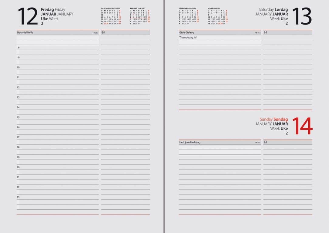 7.sans Dagbok er storselgeren hva gjelder avtalebok i A5 format. God kvalitet på omslag og innhold sikrer dine notater. Meget hendig å ha med seg. Veldig god plass for notater hver dag. Finnes i utallige versjoner. Fast innbundet eller spiralisert. Med eller uten utstansede månedstabber. Et utall av design og farger. Meget anvendelig for alle formål. Alle 7.sans produkter er miljøsertifisert etter anerkjente internasjonale standarder slik at de minst mulig påvirker vårt felles ytre miljø. Sidestørrelse: 14,8 x 21 cm A5 Hjørneperforering 70 gr papir En dag pr. side Norsk Klokkeslett fra-til: 08:00-23:00 Røde søndager og helligdager Årsoversikt innværende og neste år Månedoversikt inneværende og neste år Notatsider Norske navnedager © Norske helligdager