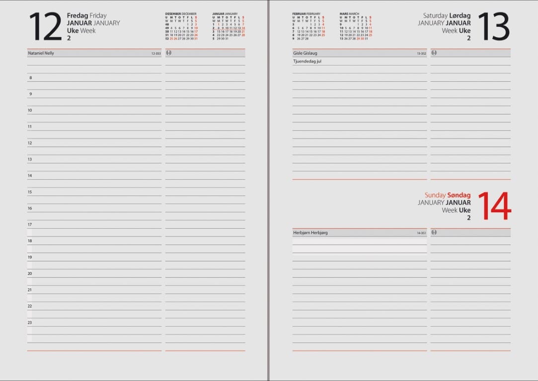 7.sans Dagbok er storselgeren hva gjelder avtalebok i A5 format. God kvalitet på omslag og innhold sikrer dine notater. Meget hendig å ha med seg. Veldig god plass for notater hver dag. Finnes i utallige versjoner. Fast innbundet eller spiralisert. Med eller uten utstansede månedstabber. Et utall av design og farger. Meget anvendelig for alle formål. Alle 7.sans produkter er miljøsertifisert etter anerkjente internasjonale standarder slik at de minst mulig påvirker vårt felles ytre miljø. Sidestørrelse: 14,8 x 21 cm A5 Hjørneperforering 70 gr papir En dag pr. side Norsk Klokkeslett fra-til: 08:00-23:00 Røde søndager og helligdager Årsoversikt innværende og neste år Månedoversikt inneværende og neste år Notatsider Norske navnedager © Norske helligdager
