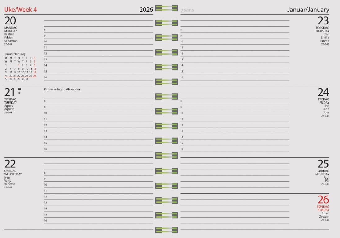 7.sans Datum er den kalender som flest personer ønsker å bruke. Gjør dine personlige notater hver dag. En lommekalender med en uke på to sider gir deg masse plass hver dag. Samtidig er den kompakt å ha med seg. Kan velges som spiralisert eller fast innbundet. Flere varianter med ulike utrykk skulle gi en variant for de fleste. Inneholder mye informasjon, samt atlas. Alle 7.sans produkter er miljøsertifisert etter anerkjente internasjonale standarder slik at de minst mulig påvirker vårt felles ytre miljø. Sidestørrelse: 8,7 x 15,3 cm Hjørneperforering 60 gr papir En uke på to sider Norsk Klokkeslett fra-til: 08:00-16:00 Røde søndager og helligdager Årsoversikt innværende og neste år Månedoversikt inneværende og neste år Notatsider og infosider 16 sider atlas Norske navnedager © Norske helligdager